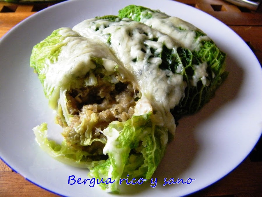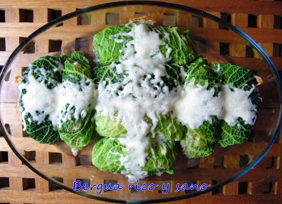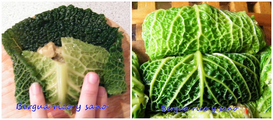 A menudo para esta receta se opta por un blanqueamiento de 2 minutos y una vez rellenos los rollitos, se les somete a una cocción larga (30-45 minutos). Para conservar mejor las vitaminas del repollo y además hacer la receta mucho más rápida de preparar, os propongo otro método. Para 8-10 rollos: