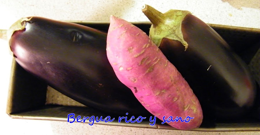 2. Mientras tanto asamos las 2 berenjenas y el boniato en el horno precalentado a 200º durante unos 40 minutos, hasta que estén muy tiernos.