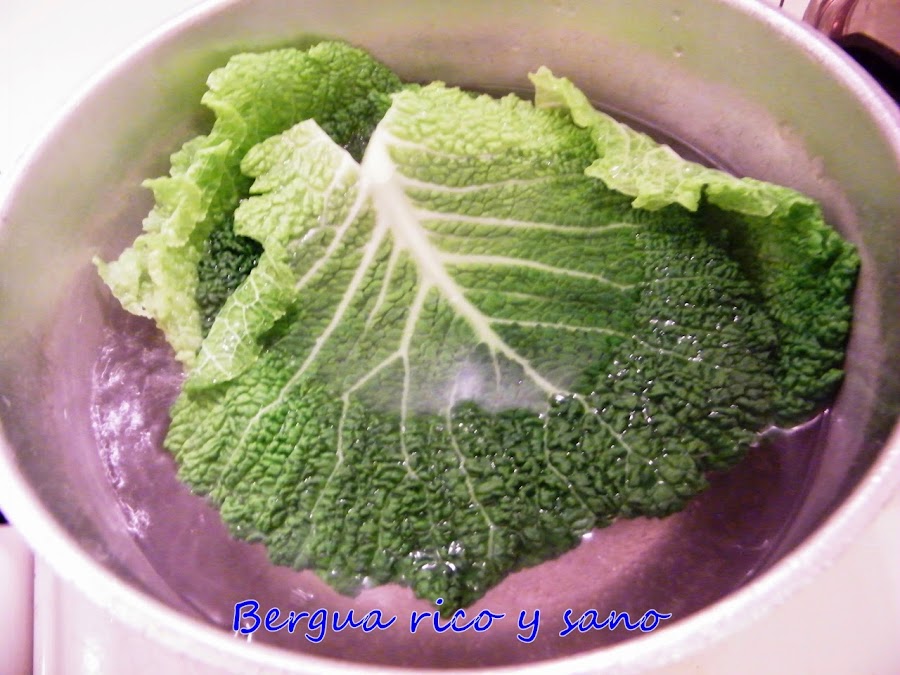 3. Separamos con cuidado cada hoja del resto de la col y retiramos la parte más dura del final del tallo sin romper la hora. Ponemos agua a hervir en una olla lo suficientemente grande y cuando hierva, introducimos las hojas delicadamente, las empujamos hacia abajo, tapamos y les damos 7-8 minutos de cocción. Podemos hacerlo en 2 tandas.