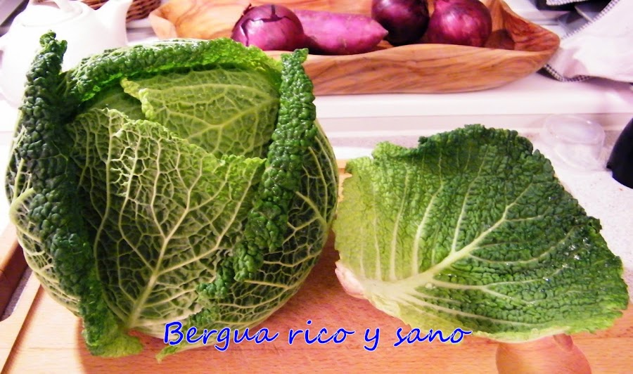8-10 hojas de repollo del que queramos; si los queremos lilas, de col lombarda; si los queremos blancos, de col blanca. Yo he usado col rizada o de Saboya.