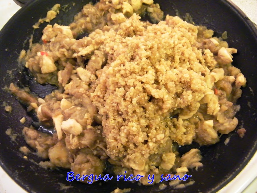 7. Cuando tenemos todos los ingredientes listos, pasamos a hacer el relleno. Primero rehogamos el pollo marinado en su salsa y cuando esté cocido, añadimos el boniato y la berenjena. Damos unas vueltas para que se impregnen de la salsa e incorporamos la quinoa. Mezclamos y retiramos del fuego.