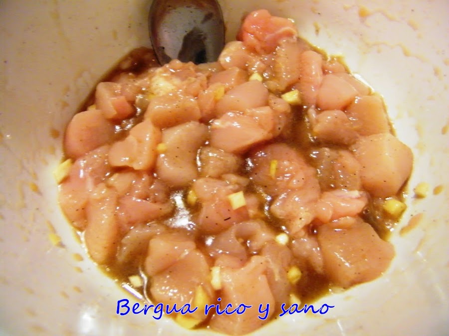 1. Cortamos la pechuga de pollo en daditos y la mezclamos con la miel, el aceite, el agua, la salsa de soja, el ajo y el jengibre picaditos, el zumo de lima, la pimienta y la gundilla. Lo dejamos marinar 1 hora en el frigorífico.