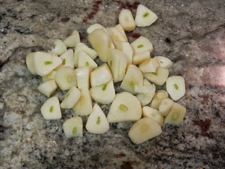 Cortamos los ajos en rodajas y los añadimos a la sartén.