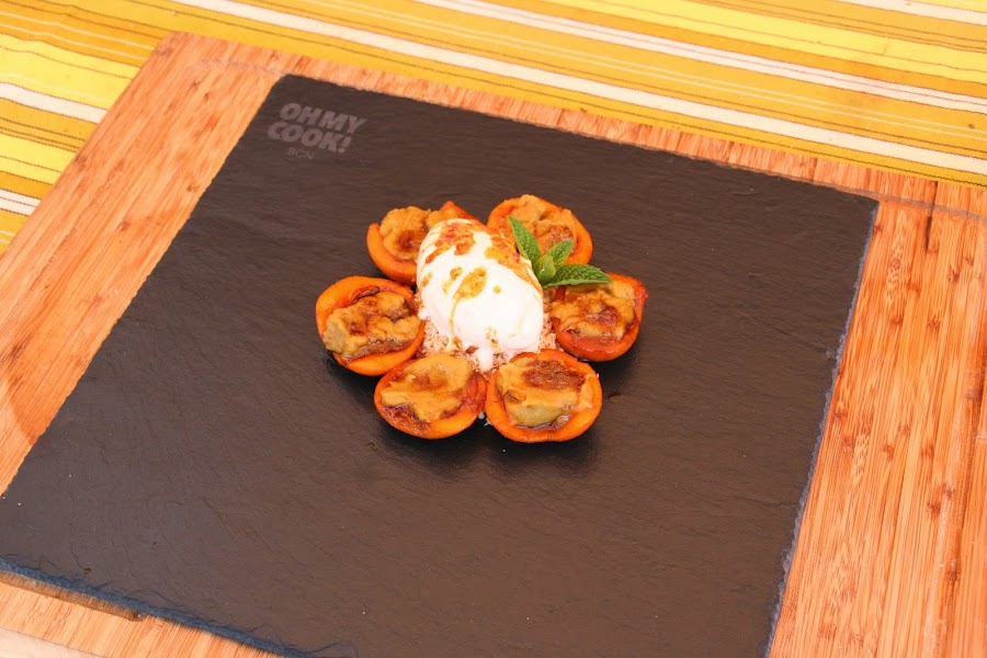 En un plato de pizarra cuadrado poner un poco de galleta en el centro y rodear con 6 mitades de níspero
