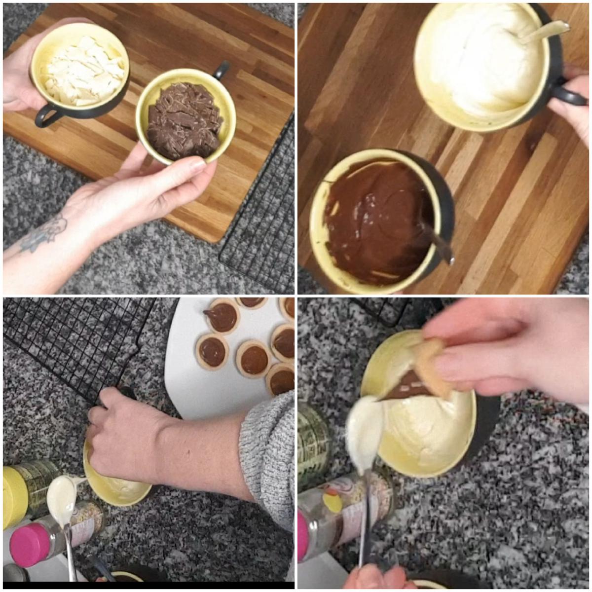 Tiempo necesario: 10 minutos.Preparar las cremas Rellenamos la manga pastelera con la crema elegida. Si está muy líquida por que en vuestra zona ahora hace calor, meter la crema un rato a la nevera para que endurezca un poquito. Le hacemos un buen corte en la punta de la manga pastelera para que la de un centímetro más o menos. Apretamos la manga encima de la galleta haciendo círculos como en un cono helado.