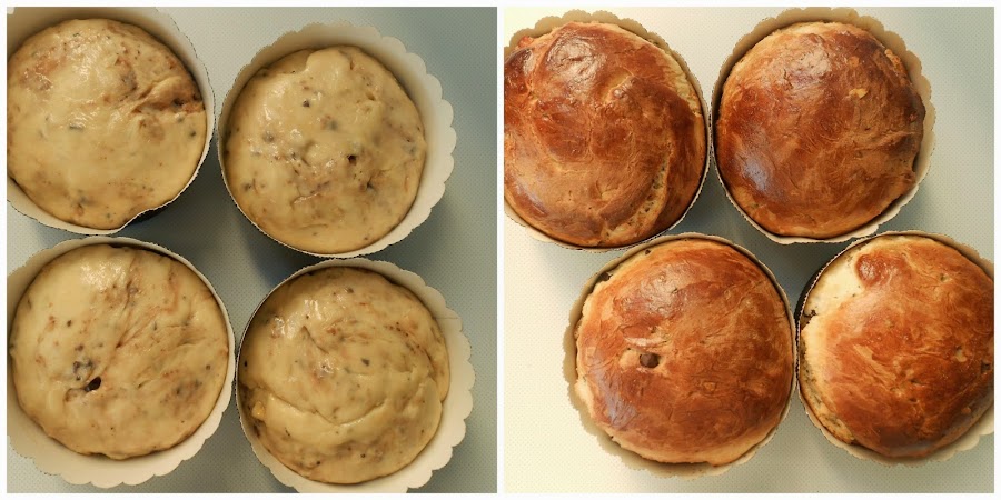 Pintar la superficie de cada pan, con huevo batido y cocinar en horno a 170º durante 25/30 minutos aproximadamente. Recuerden que cocino en un horno gas, con calor sólo de abajo y en la rejilla central.