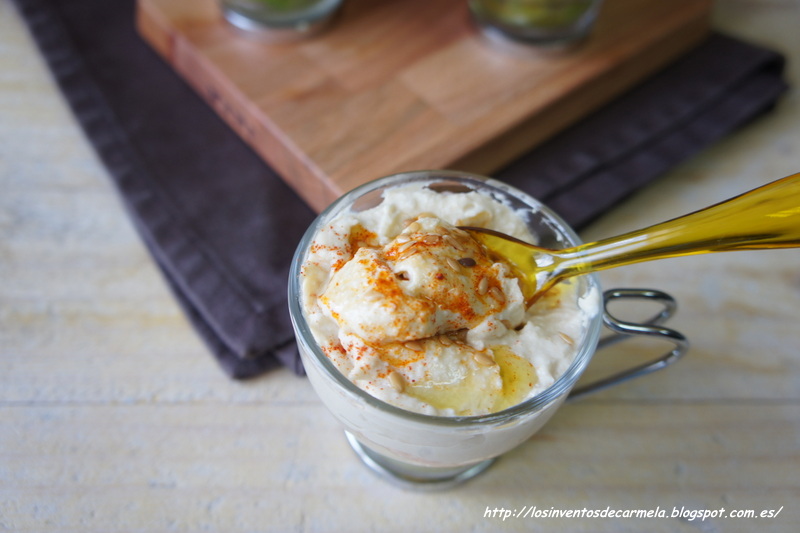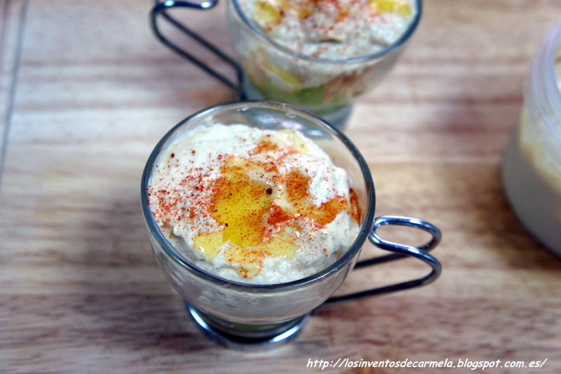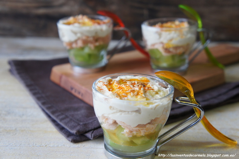Cuando puedo, me gusta inventar combinaciones de ingredientes, a veces salen estupendas las recetas y otras ... bueno, no tanto jaja, ayer ya os puse el primer vasito salado de esta semana especial temática del aperitivo en forma de vasito salado.
