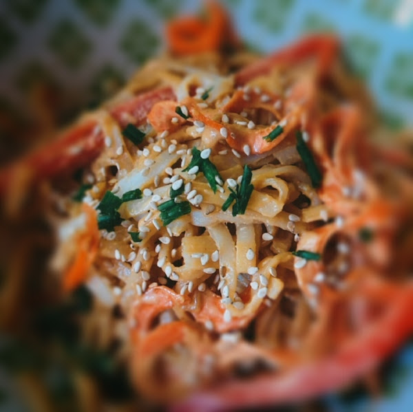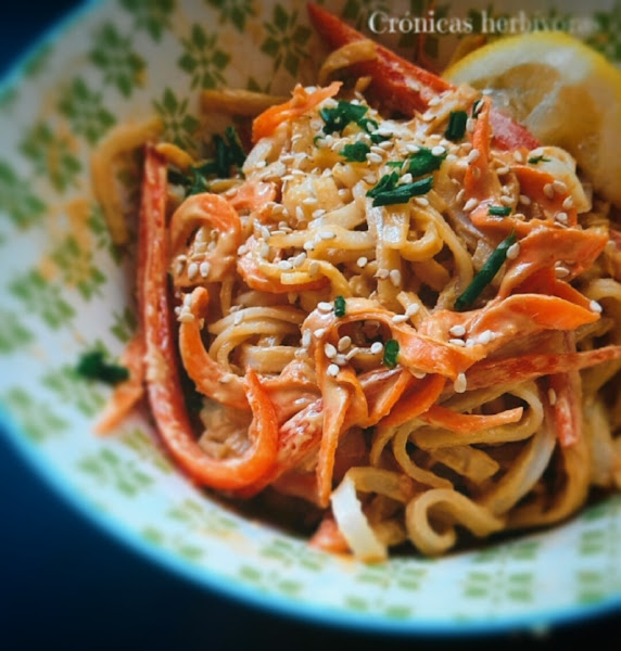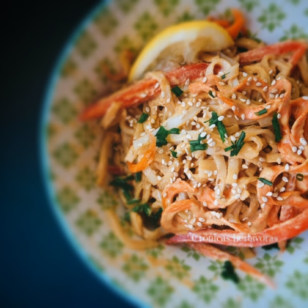 La ventaja de estos noodles es que al ser de arroz, pueden tomarlo personas que tengan algún tipo de intolerancia al trigo. Además, lleva las verduras crujientes sin cocer y lleva una salsa cremosa, especiada y protéica, que es la que lleva todo el protagonismo en esta receta.