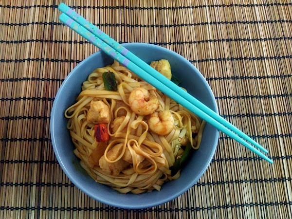 Por un lado tendremos que poner agua a hervir, para los noodles, estos fideos se cuecen en un minuto o en dos, dependiendo del fabricante, así que no los coceremos hasta el último momento, y por el otro pondremos una sartén a calentar, y como todo se hace más o menos al tiempo lo echaremos casi todo a la vez, empezaremos por el pollo, seguidos por la verdura y lo ultimo las gambas, pero más o menos serán unos 5 minutos, para que las verduras se queden al dente y el pollo y las gambas no se nos queden secas.