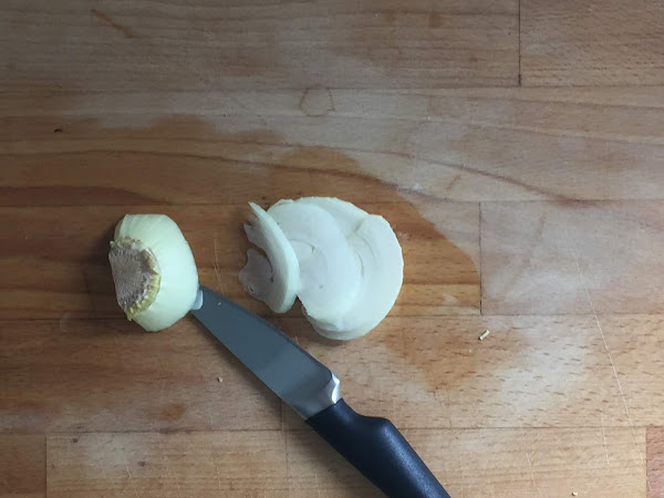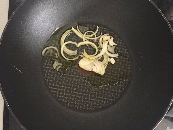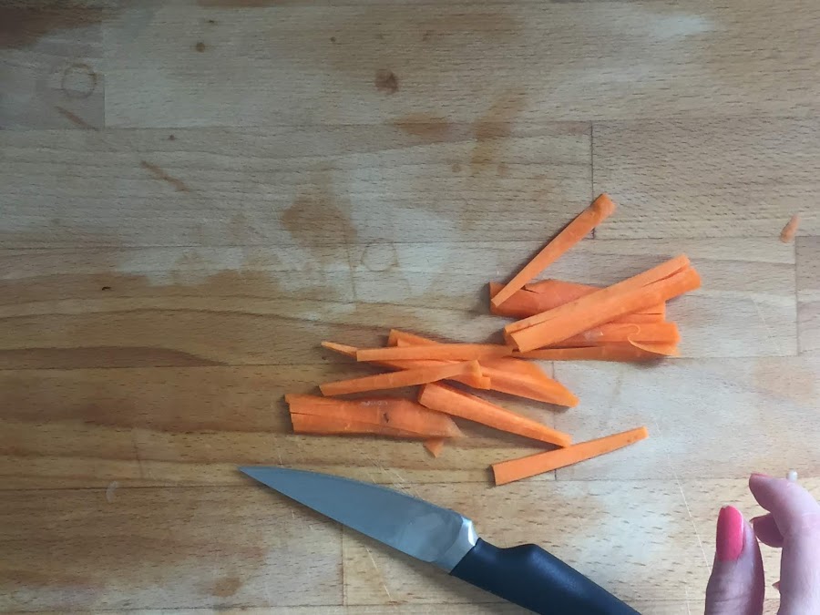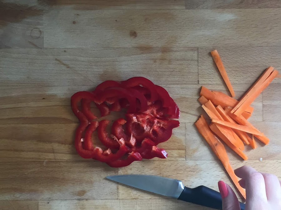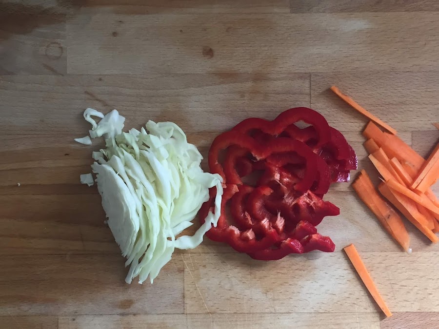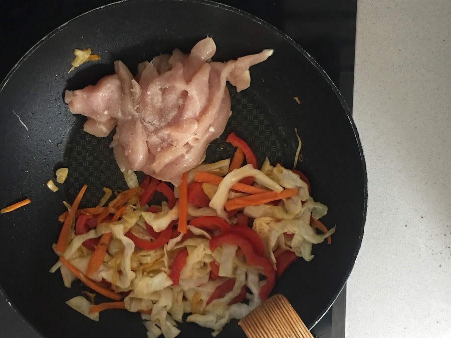 Mientras, cortamos las cebolla y la rehogamos en una sarté tipo Wok con un poco de aceite. También podemos pelar y cortar la zanahoria, el pimiento y el repollo, que añadiremos cuando esté la cebolla pochada. A mi me gusta cortar tanto las verduras como el pollo en tiras.