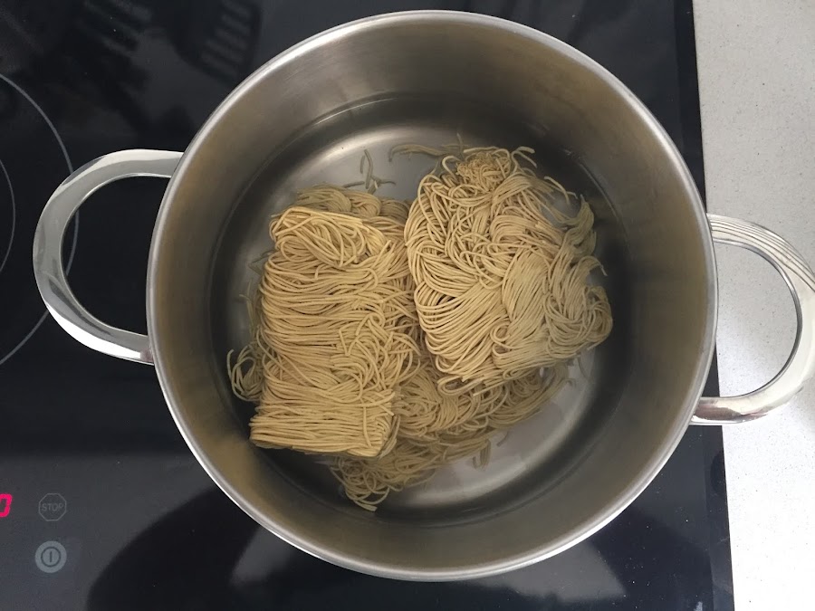Primero ponemos agua con sal a cocer, y cuando rompa a hervir, añadimos los noodles secos. Dejaremos cocer unos 5-7 min, o seguiremos las instrucciones del paquete. A mi me gusta añadir al agua un poco de saborizante de caldo de pollo para que le de algo de sabor, pero esto es opcional.