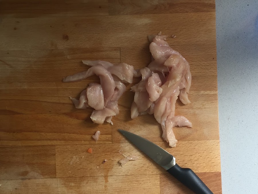 También, cortaremos el pollo en tiras, lo salpimentamos y lo añadimos al Wok, subiendo un poco el fuego para que el pollo se haga rápido.