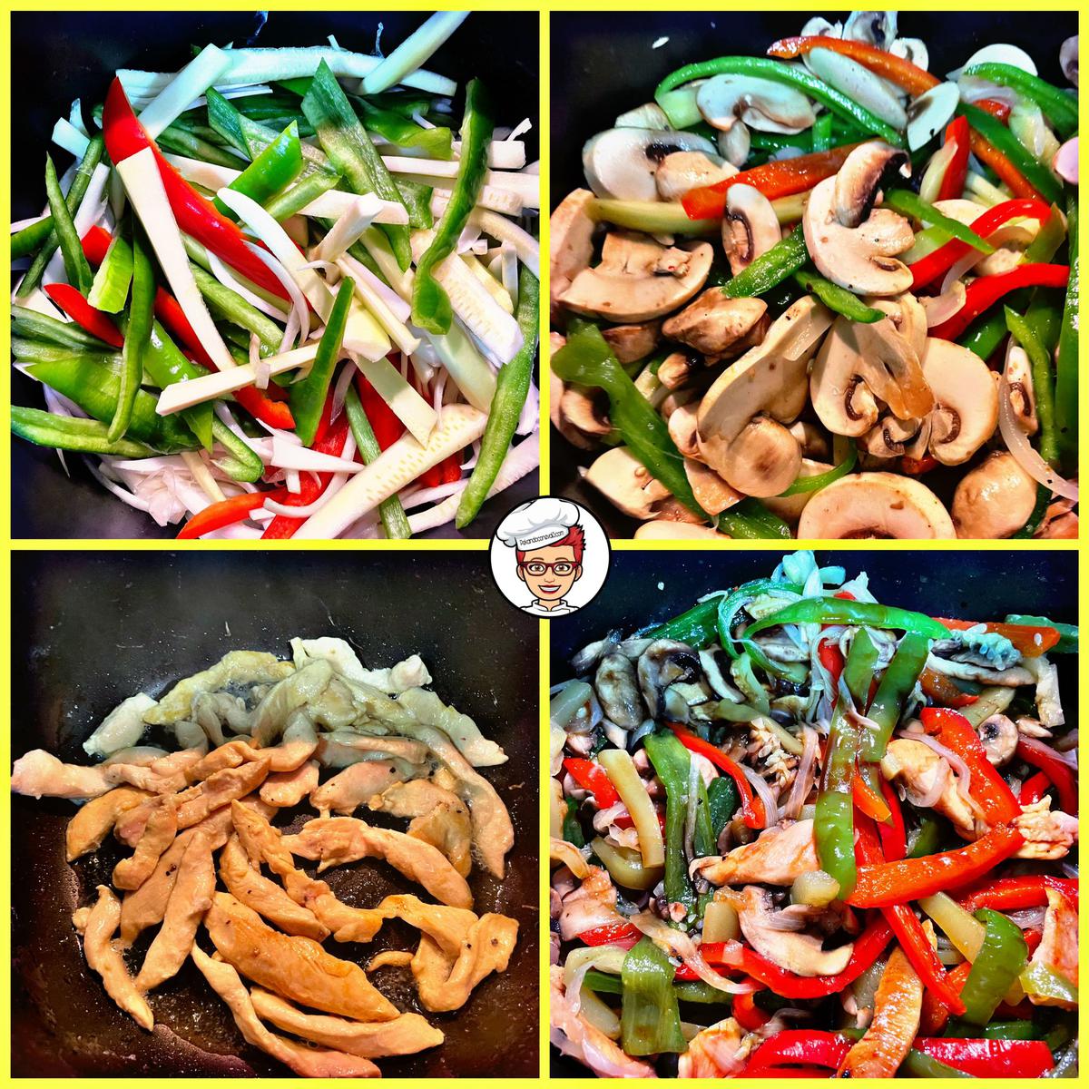 He puesto aceite, menú freír y he añadido el pollo, cuando ha cogido color le he vuelto a añadir la verdura y le he puesto salsa de soja al gusto.