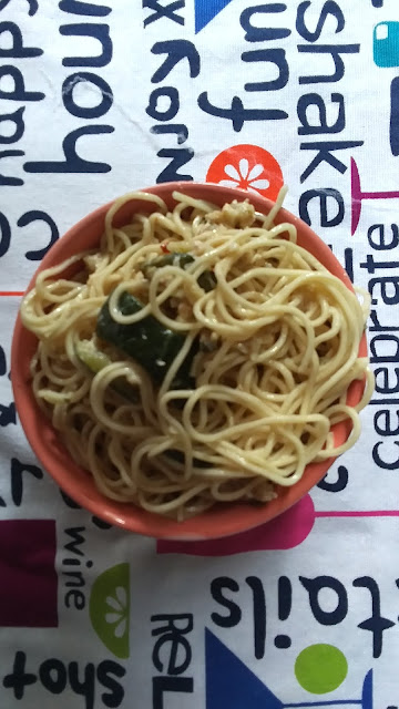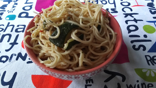 Me sobró un poco de revuelto de calabacín con atún que hice la noche anterior, así que se me ocurrió mezclarlo con unos noodles que rondaban en la despensa y un poco de chile picado que también tenía olvidado. Quedó un plato sencillo pero lleno de sabor.