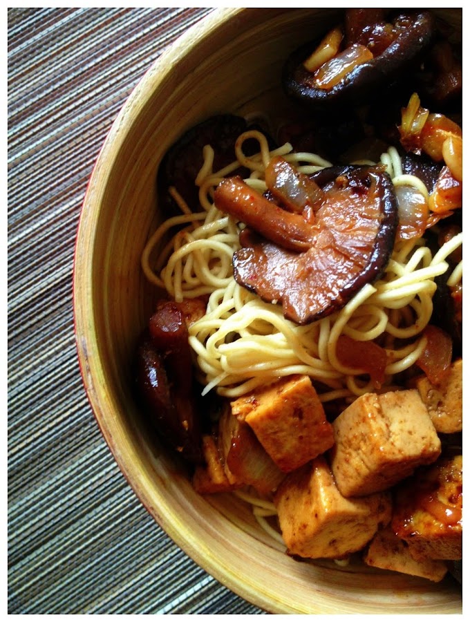 En este caso tenía noodles (siempre tengo algún paquete) setas en conserva que había comprado hacía tiempo y tofu que ya llevaba dos días caducado (casi nunca hago demasiado caso a la caducidad y lo aproveche). Como estamos en plena época de setas pensé que unos noodles con setas y tofu sería un buen plato para acompañar este día de perros y sofa!