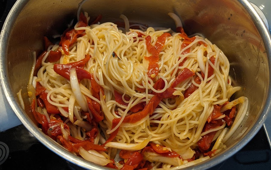 Hervimos los noodles en abundante agua con sal y escurrimos. Mezclamos muy bien con la mezcla de pimientos reservada