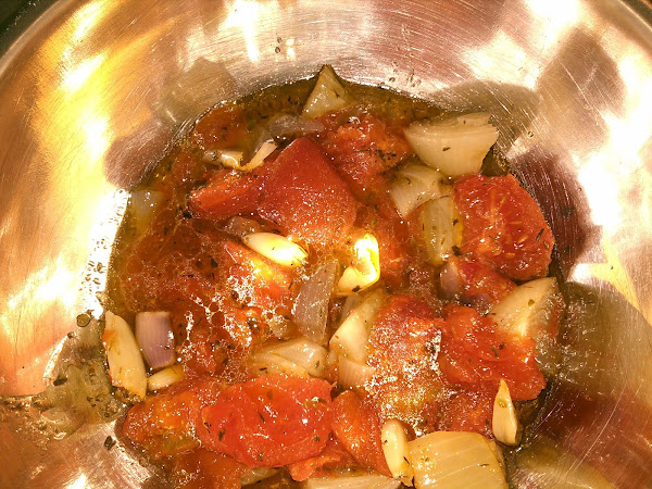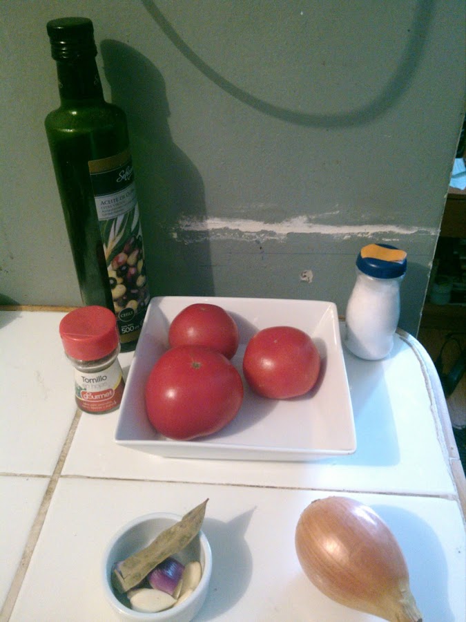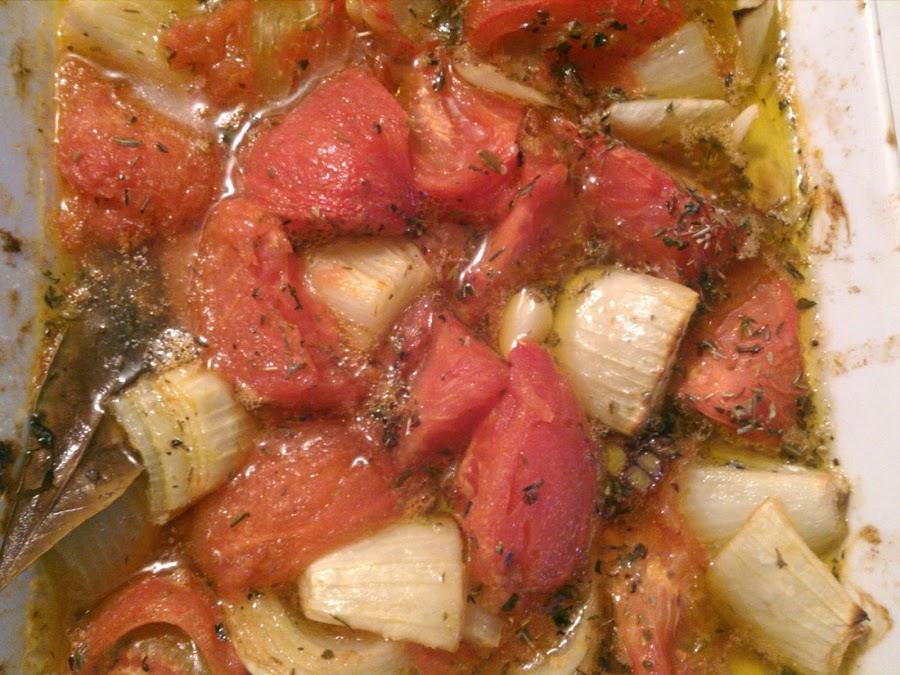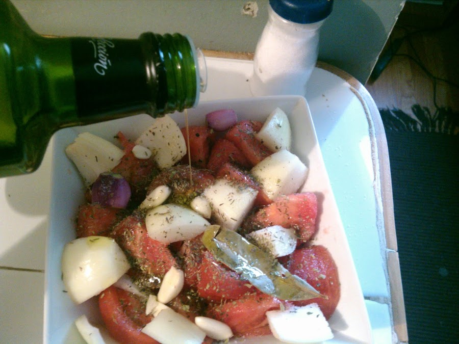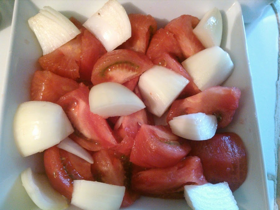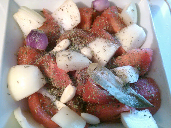 Agregar en un recipiete apto para el horno el tomate pelado y picado en cuartos al igual que la cebolla, agregamos igualmente el ajo, la chalota, la hoja de laurel, el tomillo y la sal. Muchas personas me preguntan porque pelo el tomate, bueno yo vivo en Chile específicamente en Antofagasta la capital minera mundial, y como la cascara del tomate bioacumula metales pesados prefiero prevenir que curar.