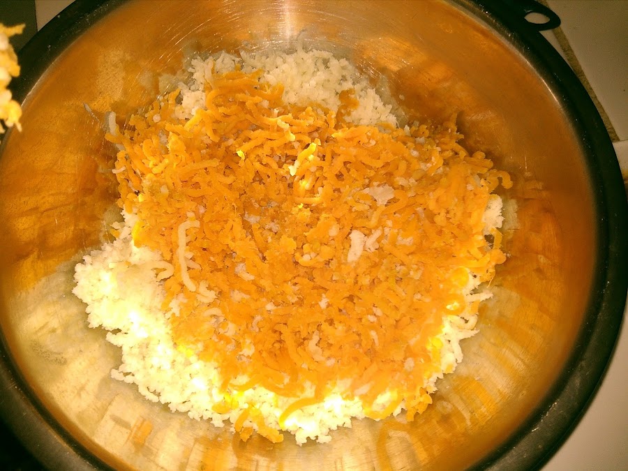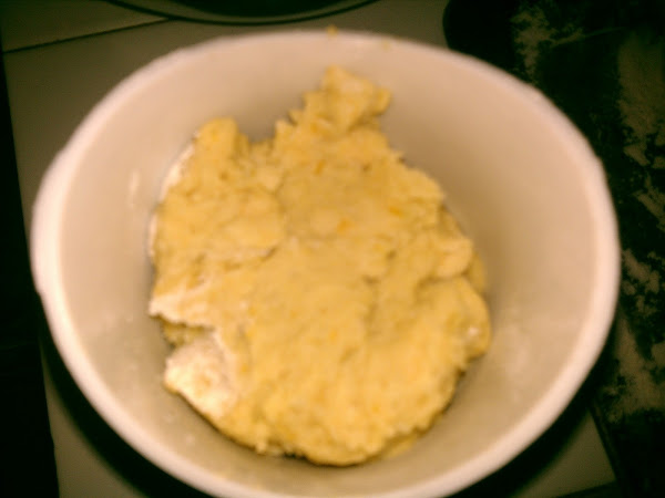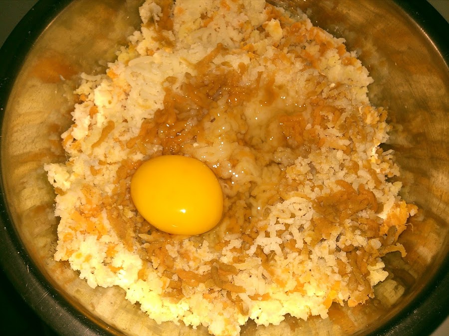 Pasar luego por un prensa papas tanto las papas como el camote. Incorporar luego el huevo.