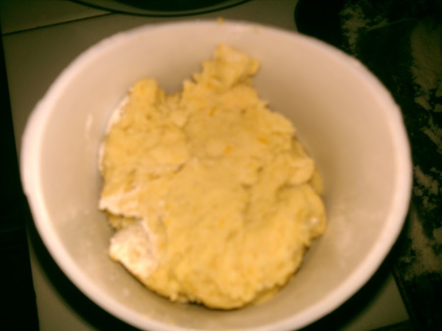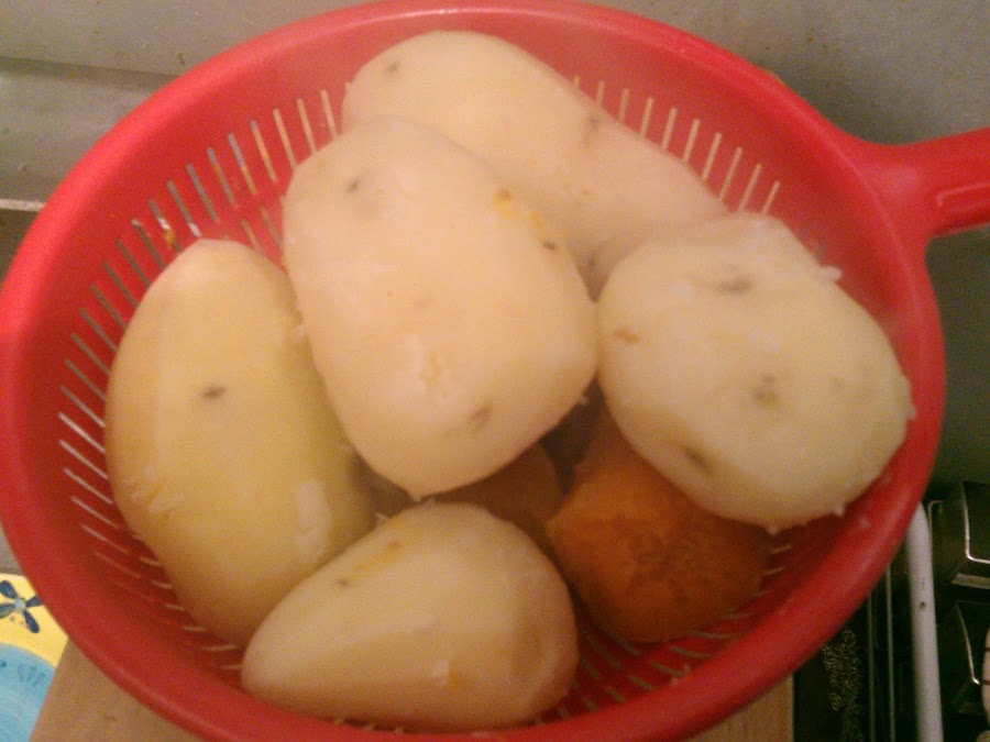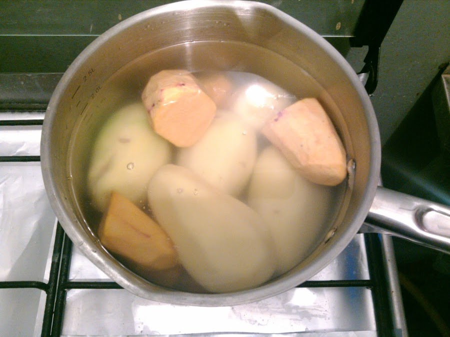 Poner a cocer en abundante agua con sal las papas con los camotes pelados. Una vez cocidos se retiran del fuego escurriendo toda el agua. Para mayor cantidad la proporción es de 700 gr de papas y camotes por 300 gr de harina.