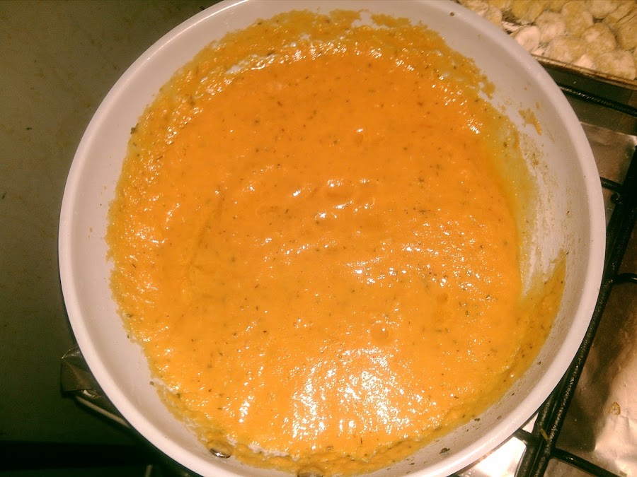 Luego se lleva la salsa a una sarten, agregamos una cucharadita de azúcar para evitar la acidez del tomate, ojo con pasarse con el azúcar, recuerden que el camote ya es un poco dulce. También aprovechamos de rectificar si esta bien de sal, una vez lista la salsa agregamos los ñoquis recién sacados de la olla de cocción.