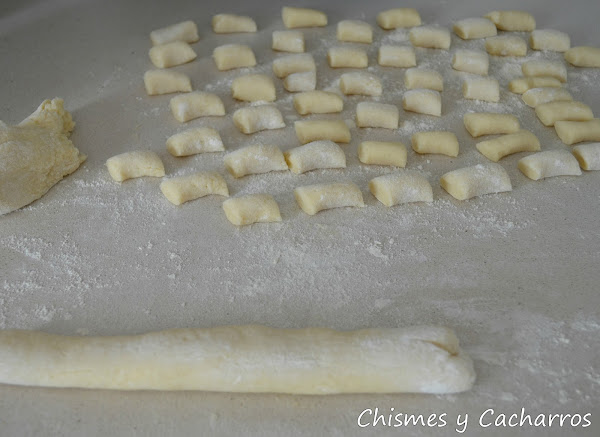 Espolvorear un superficie con harina, coger un trozo de masa y estirar formando un cilindro cortar con un cuchillo y poner a un lado. Acabar con la masa y para dar el detalle dentado necesitamos un tenedor. Espolvorear los ñoquis con un poco de harina para que al marcar con el tenedor este no se quede pegado.