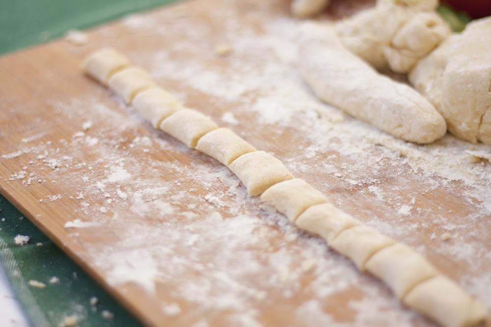 Para darles la forma tan característica de los ñoquis, tendremos que coger un trozo de masa y con las manos ponerlo de manera alargada. Ahora con un cuchillo hacer cortes como de un dedo de ancho.