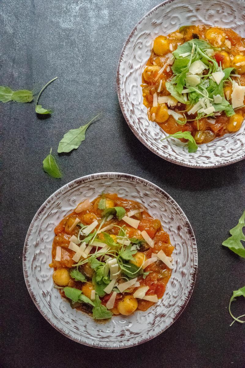 Servimos caliente en platos individuales. Decoramos poniendo hojas de rúcula y espolvoreando con queso parmesano.