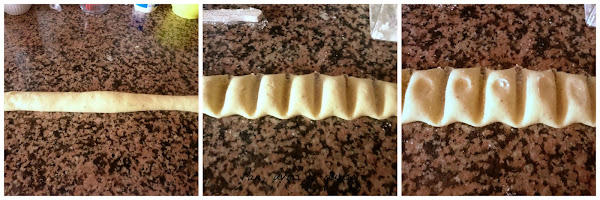 Dividimos la masa por la mitad y formamos un rollo largo de 1,5 centímetros de grosor con cada trozo. Con el mango de un cuchillo enharinado, cortamos en trozos de 2 centímetros para hacer los ñoquis. Hacemos una muesca en cada uno presionando con el dedo enharinado en el centro. Esto permitirá que la salsa penetre más en el centro y los ñoquis tengan más sabor.