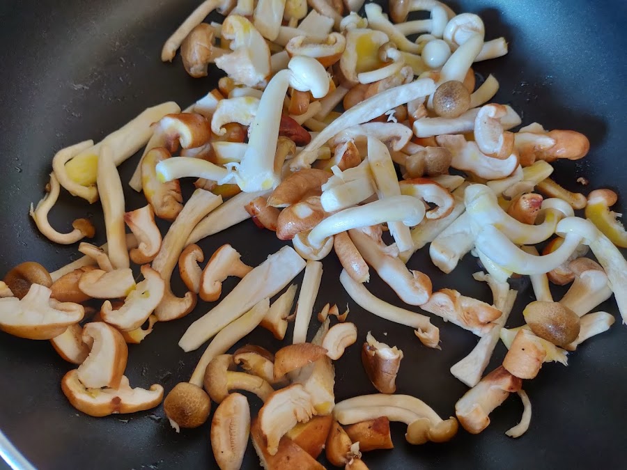 Ponemos agua a hervir para cocinar los ñoquis y, mientras tanto, cortamos las setas y las ponemos a fuego medio en una sartén con un chorrito de aceite.