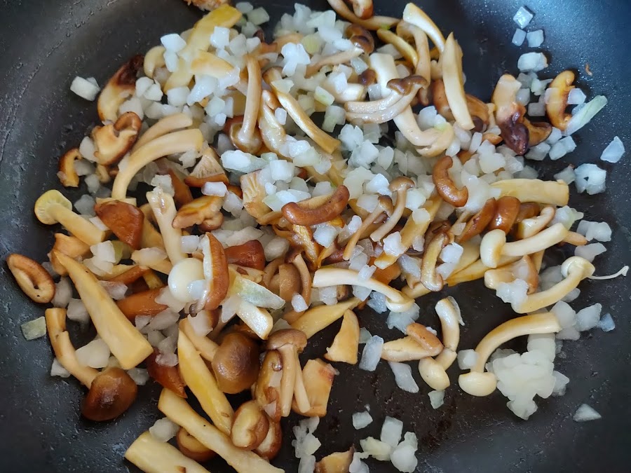 Pasados unos 5 minutos, cuando las setas hayan cogido algo de color, añadimos la cebolla picada y dejamos cocinar hasta que se dore a fuego bajo.
