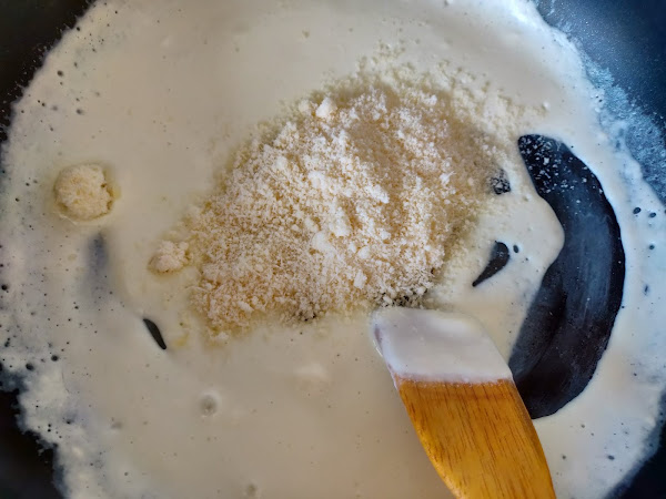 Seguidamente agregamos el queso parmesano y removemos hasta que se funda y se incorpore a la salsa.