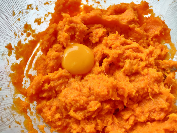 Seguidamente separamos la clara de la yema e incorporamos esta última al boniato. Mezclamos bien hasta que esté integrada por completo.