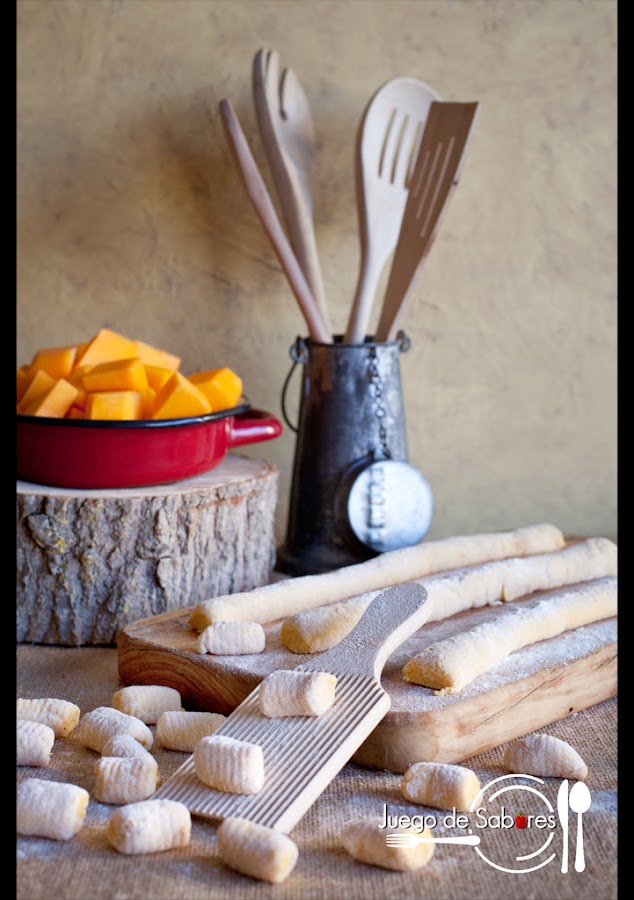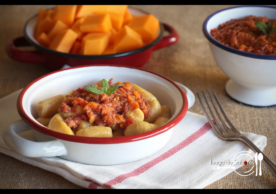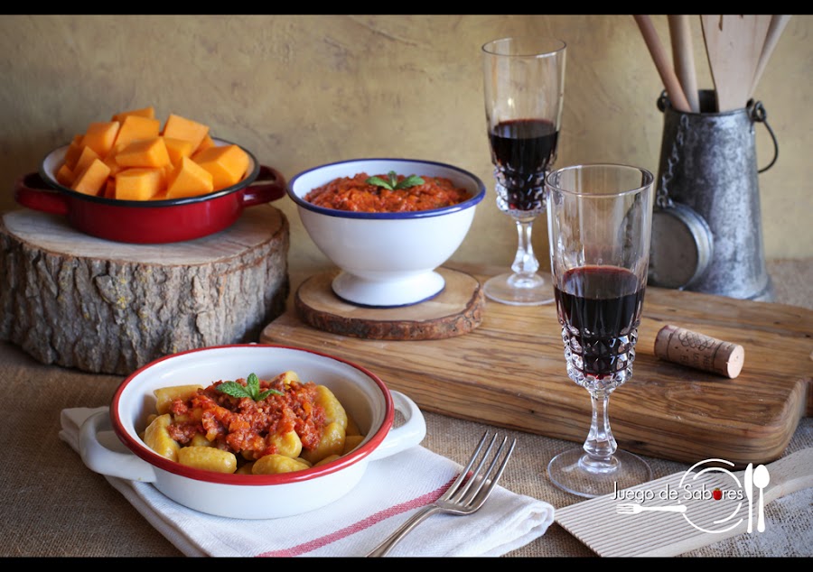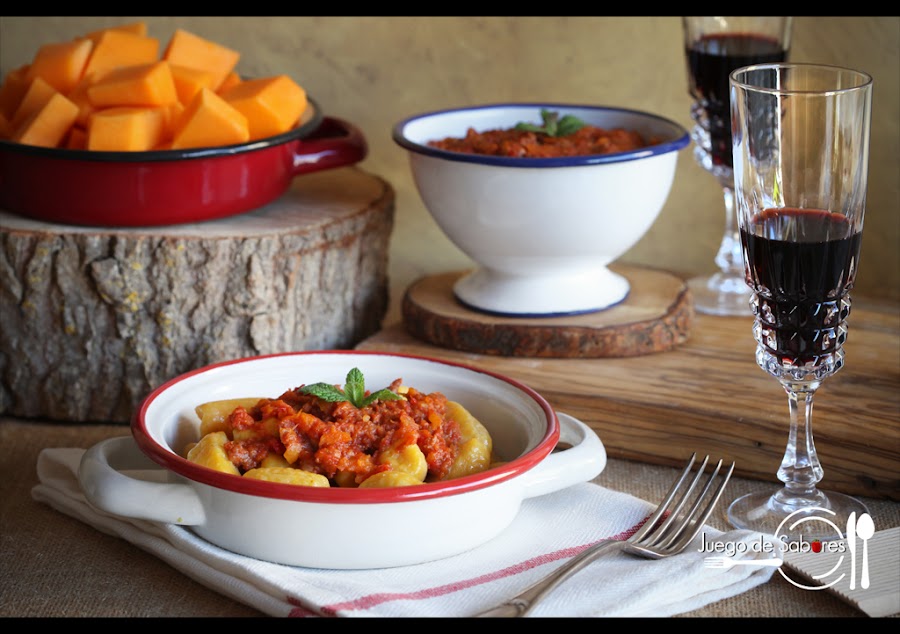 Cuando en su día hicimos y hablamos de los ñoquis decíamos que la base fundamental era la patata junto con la harina y el huevo; que se amasaban y se hervían en agua y sal. Que si se comían tal cual tiraban a sosos por lo que convenía acompañarlos siempre de una buena salsa. En Nápoles a los ñoquis (gnocchi) se les llamaba “estrangulacuras” (strangulapriévete) porque cuentan que había un famoso literato napolitano y célebre glotón, el abad Galiano, que un día comió con voracidad tantos que se atragantó y –se dice- que murió en el acto. Vamos, que pasó a mejor vida aunque, eso sí, bien atiborrado de gnocchi. Como todas las historias que se cuentan por ahí, lo prudente es ponerlas en duda. Sea como sea, no pretendemos que nadie se vaya de este mundo por glotón y menos sin haber probado estos ñoquis de calabaza que hemos acompañado de una salsa boloñesa. Aunque os sepan a gloria, seguís en la tierra.