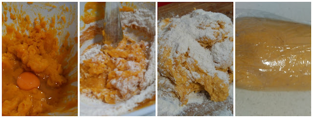 Hacemos un puré con la calabaza y la patata,añadimos el huevo una pizca de sal y pimienta.Mezclamos todo muy bien.