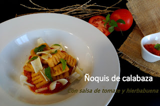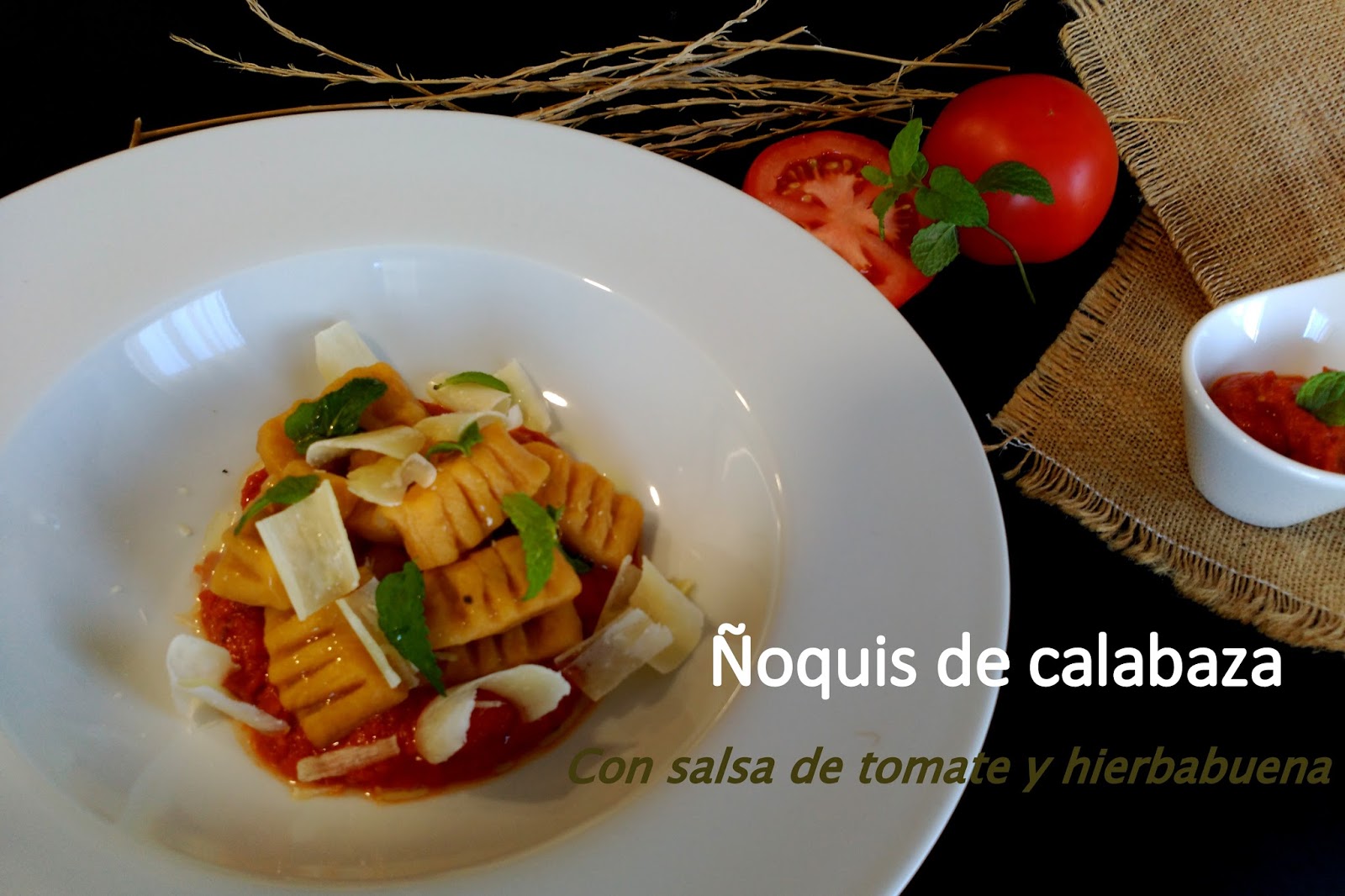 Servimos los ñoquis con la salsa de tomate acompañamos con parmesano y unas hojas de hierbabuena.Rociamos con aceite de oliva virgen extra.
