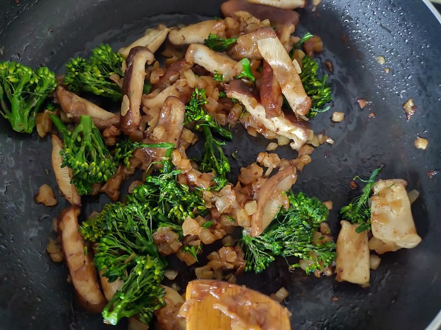 En la misma sartén salteamos media cebolla picada y la setas troceadas.
