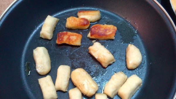 En una sartén, ponemos un poco de aceite de oliva. Salteamos nuestros ñoquis dos o tres minutos por los dos lados. Añadimos mantequilla y dejamos que se hagan. Con esto se busca que queden crujientes por fuera y jugosos por dentro.