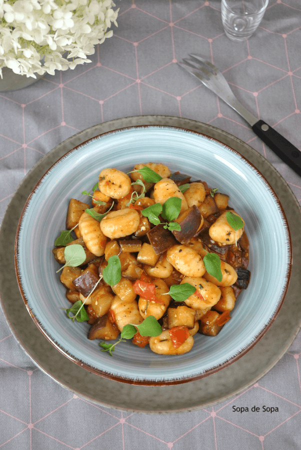 Una combinación de Ñoquis de patata con berenjena y tomate al cual éste último saltearemos poco para que nos de frescor al plato. Estoy segura que os encantará.