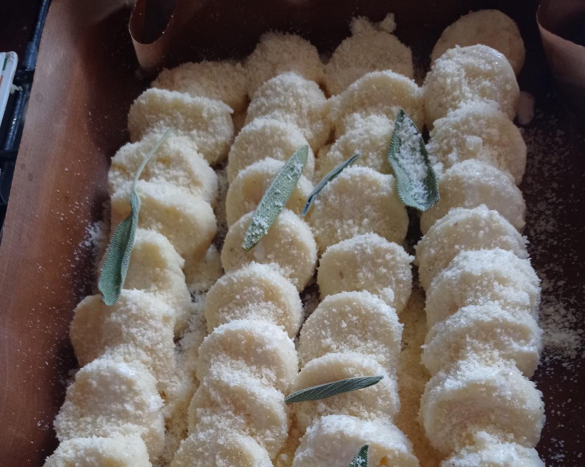 Curiosidades de la cocina, encontrar que estos bocaditos de forma redonda, se han bautizado como ñoquis a la romana, o ñoquis de sémola, sin tener la forma típica de los gnocchi, que justamente llevan ese nombre porque significa bollo, grumo o pelotilla.Del dicho al hecho….