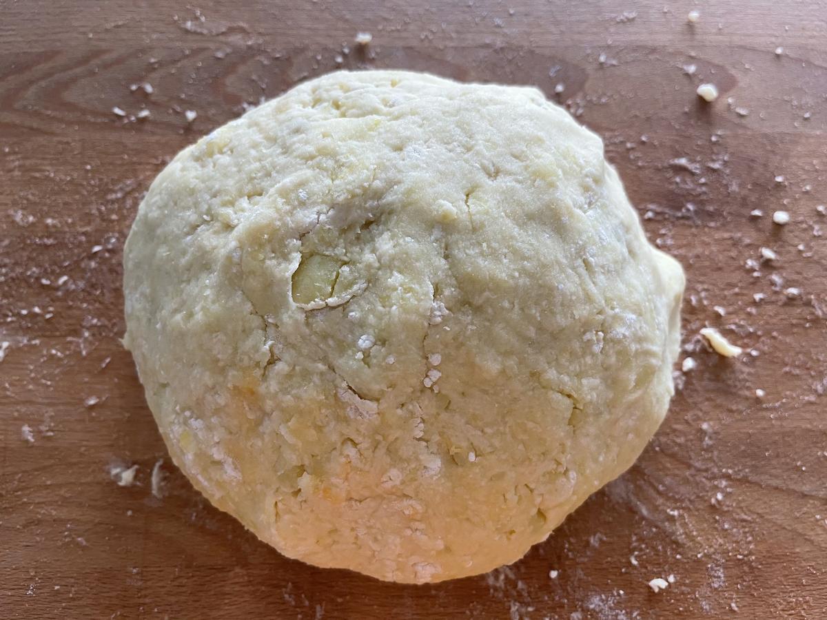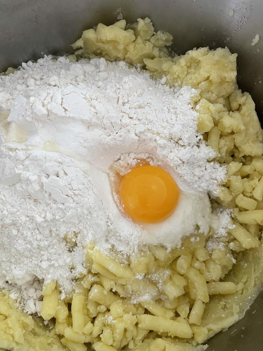 Primero lavaremos y pelaremos las patatas. Una vez cocidas, pasaremos por el prensapuré y dejaremos que entibie o enfríe completamente.