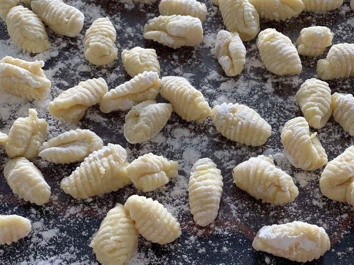 Dispondremos los ñoquis sobre una placa enharinada. Armaros de paciencia porque los ñoquis demandan mucho tiempo, pero es una actividad que podéis hacer con los peques y les encanta! Y de verdad que tener varias manos para esta tarea nunca está demás porque es una tarea laboriosa.