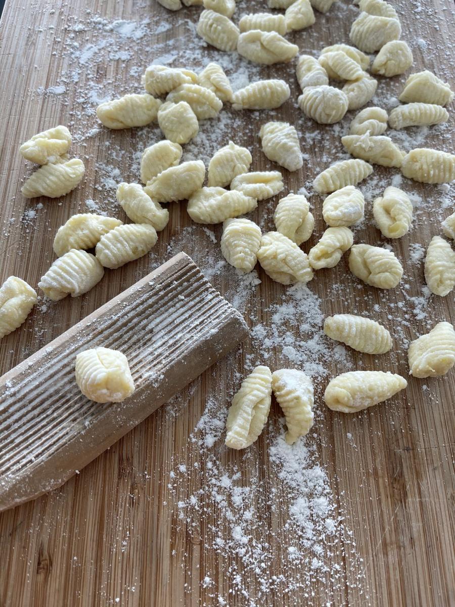 Sobre una tabla grande de madera, extenderemos harina para comenzar a trabar nuestra masa. Cortaremos trozos y estiraremos haciendo formas de salchichas, cortaremos en pequeños trocitos y pasaremos por la madera especial para ñoquis o en su defecto por un tenedor para hacer ese acanalado tan característicos de los ñoquis.