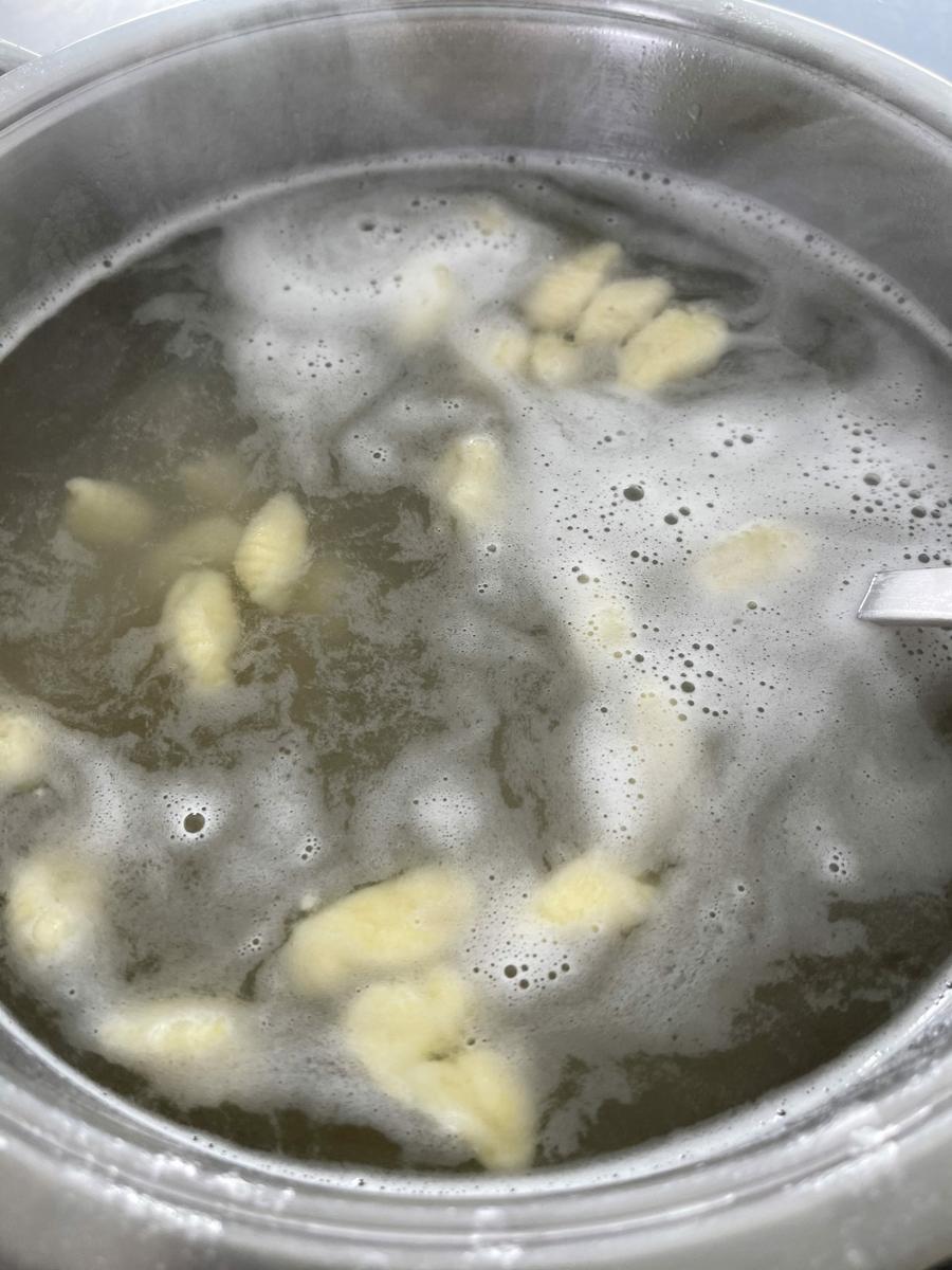 Una vez tengáis toda la masa hecha (cuidar de no pegar entre sí los ñoquis ni apilarlos porque corréis el riesgo de que se peguen) calentaréis una olla bien grande y con abundante agua para cocerlos. El truco de los ñoquis es que están listos cuando suben! A diferencia de las demás pastas que hay que probar para saber si están al dente, aquí solo tenéis que pescar esos ñoquis que van subiendo a la superficie con una espumadera grande a medida que van apareciendo.