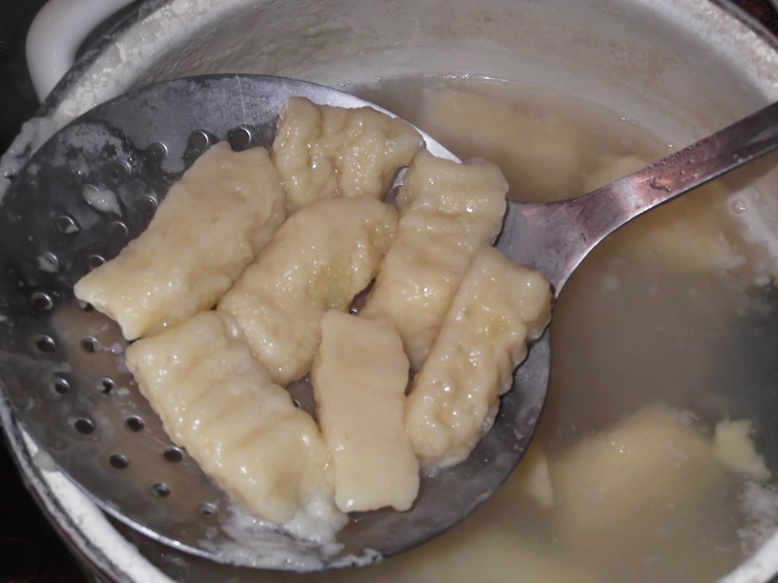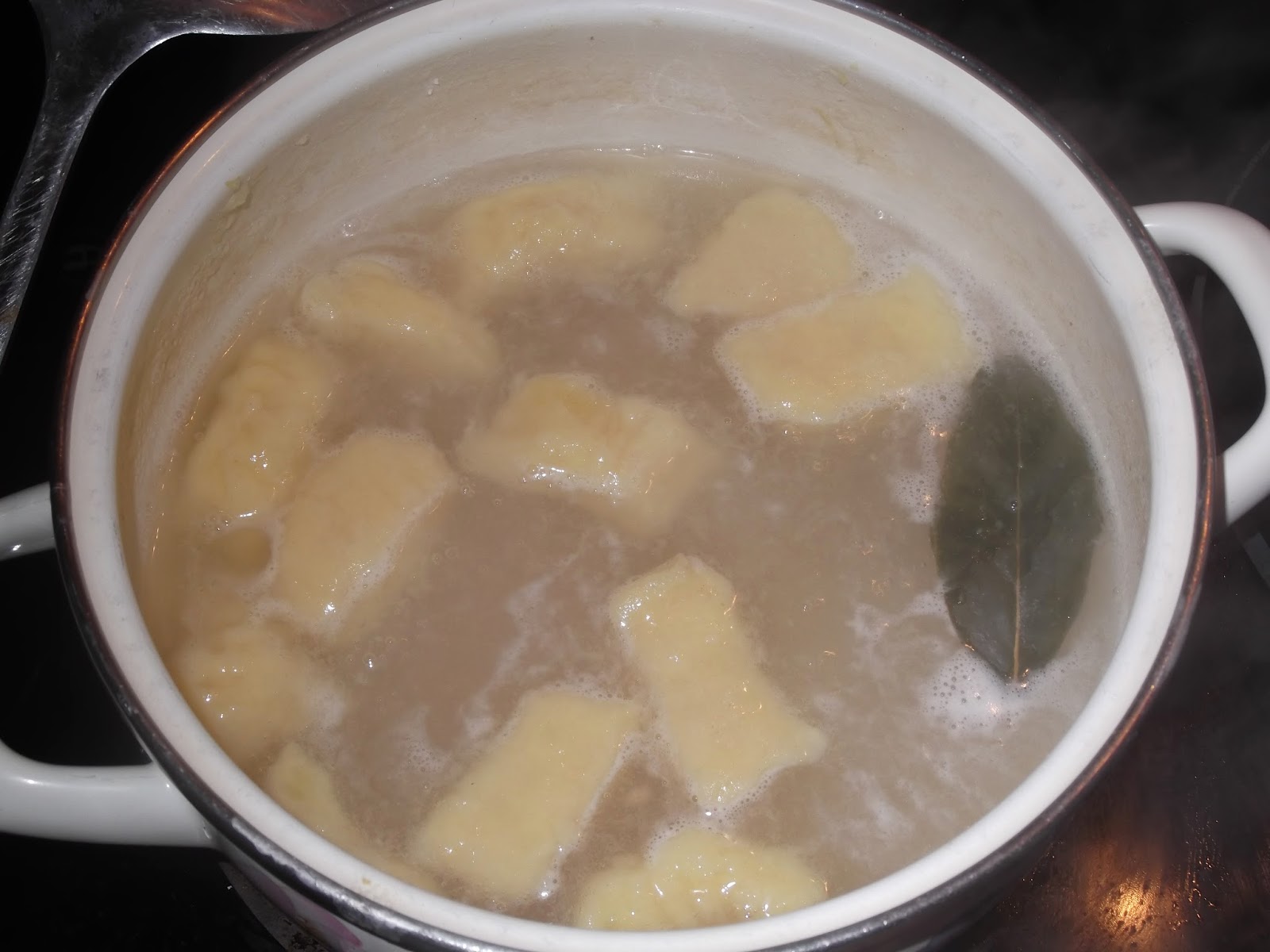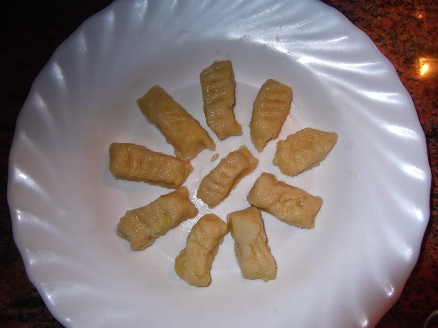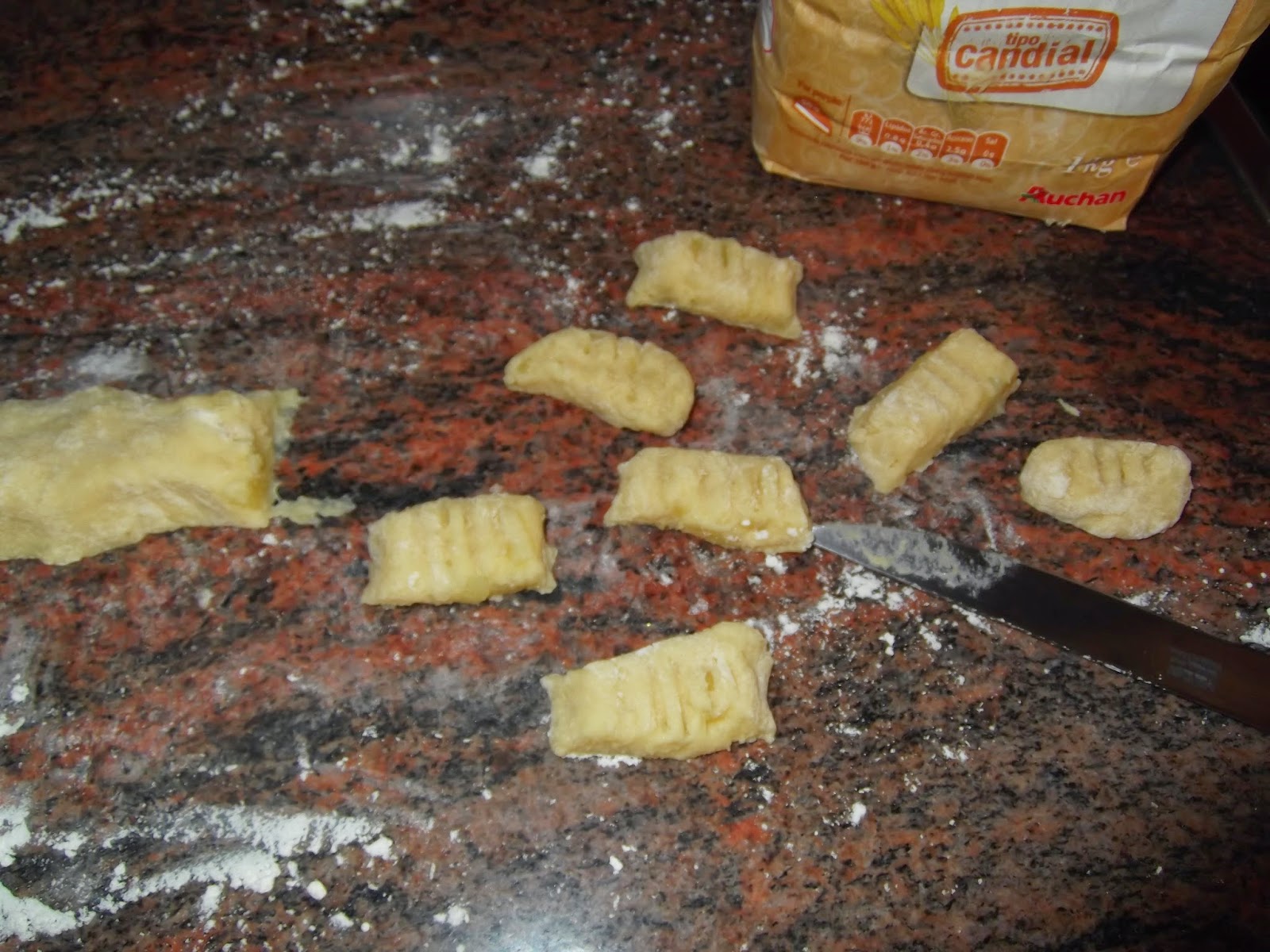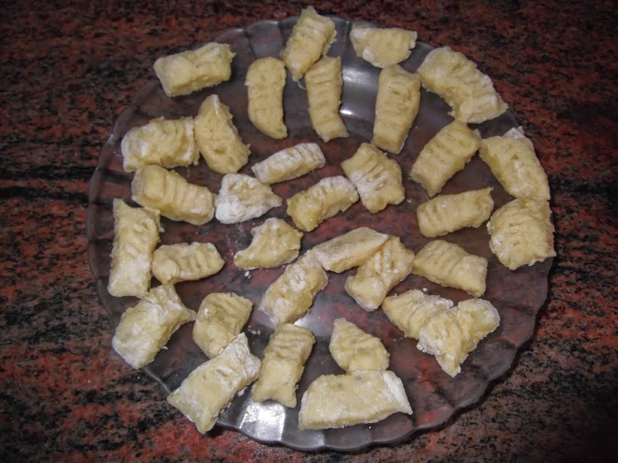 Separamos un poco de masa y vamos haciendo un cilindro que cortaremos en porciones pequeñas. Luego con un tenedor le hacemos una marca rayada y ya están listos para cocer. Ponemos en una olla agua, sal y un par de hojas de laurel y vamos echando los ñoquis en cantidades pequeñas para que tengan espacio suficiente y no se peguen entre ellos.