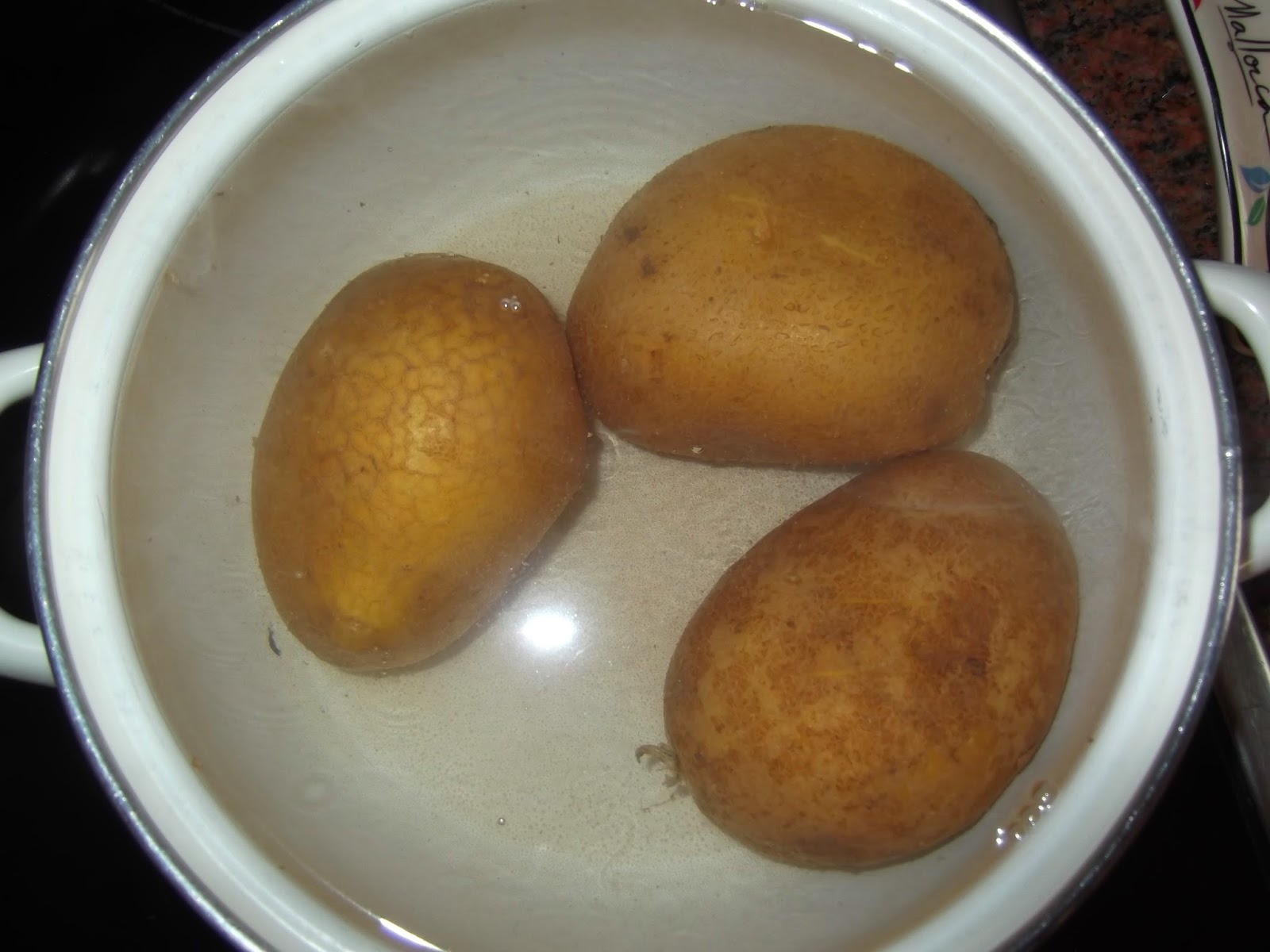 Lo primero que hacemos es lavar las patatas, quitarles la tierra y cocerlas durante 30 minutos en abundante agua hirviendo, aunque eso dependerá del tamaño y dureza de la patata. Se cocina con la piel para evitar que absorban agua durante la cocción.