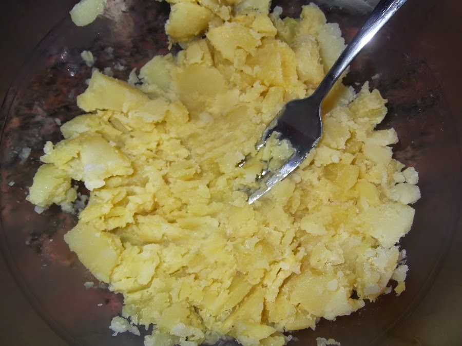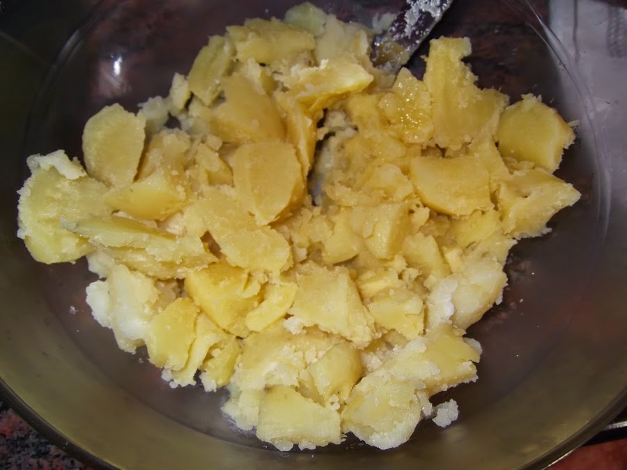 Una vez que pinchemos las patatas con un cuchillo y comprobemos que están hechas las dejamos enfriar durante 15 minutos y las pelamos. Las dejamos enfriar durante otros 5 minutos y comenzamos a cortarlas en trozos. Luego con un tenedor o pasapurés hacemos el puré de patata. Lo más importante de este paso es que no queden grumos.
