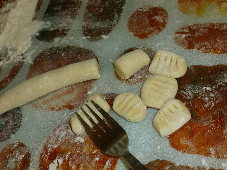 Coger porciones de la masa e ir formando rollos en una superficie enharinada. Cortar los mismos en trozos de unos 2 cm y hacer bolas con la mano. Después hay que hacer girar esas bolas bajo un tenedor para que queden los dientes marcados.