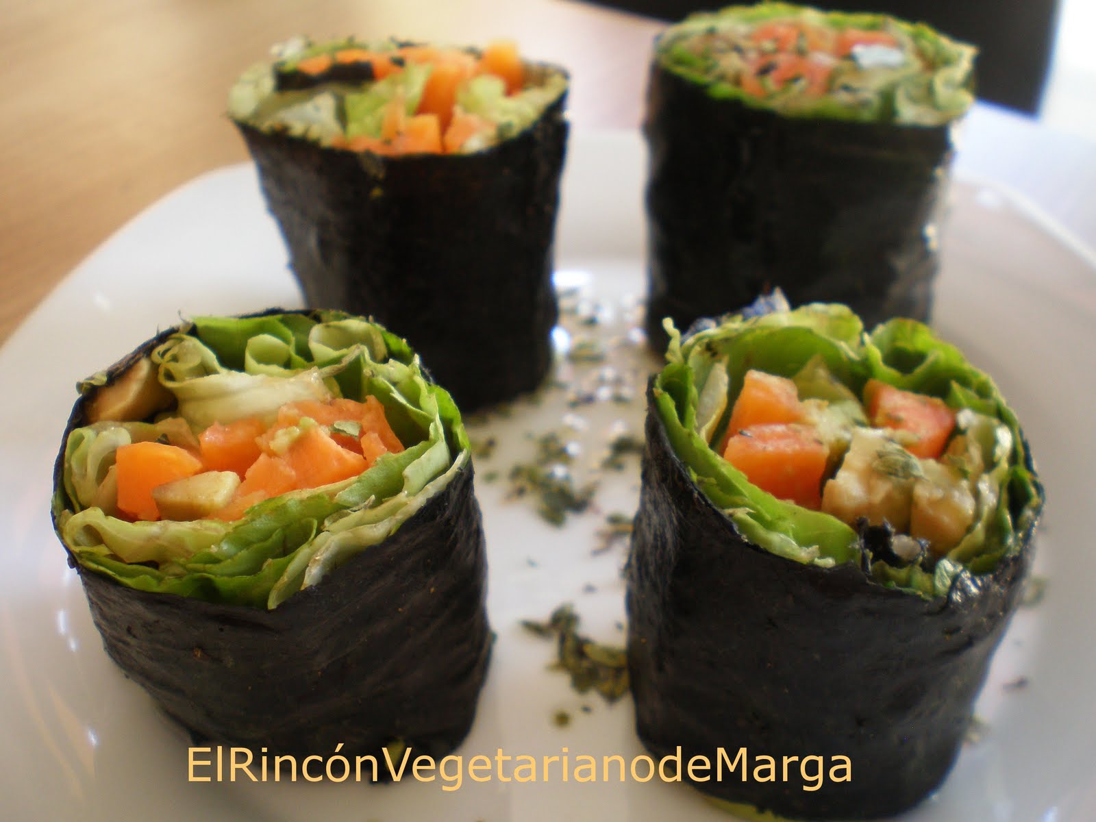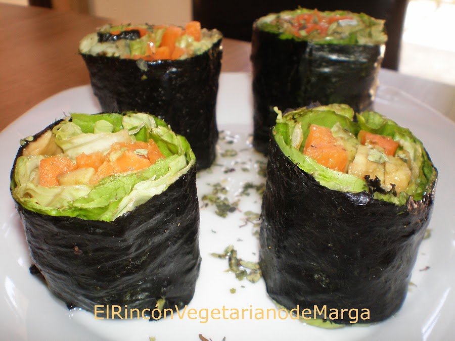 2 hojas de alga nori, hojas de lechuga romana o iceberg, 2 zanahorias, 1 aguacate, aceite de oliva virgen, sal marina y orégano seco.