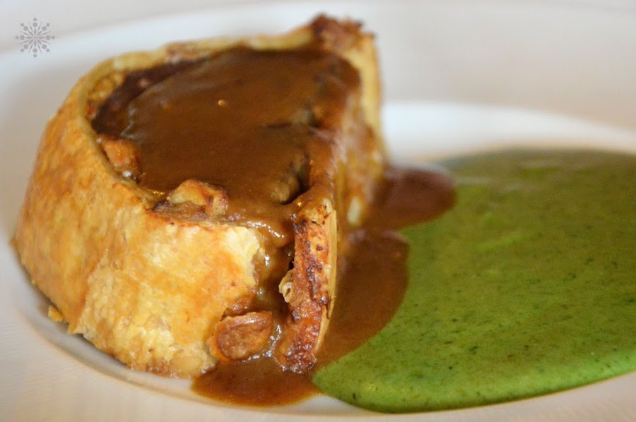 Y por fin llegó el Solomillo Wellington: carne tierna, jugosa y un hojaldre exquisitamente crujiente. Sencillamente perfecto: nunca había probado en Madrid un Solomillo Wellington de esta calidad.