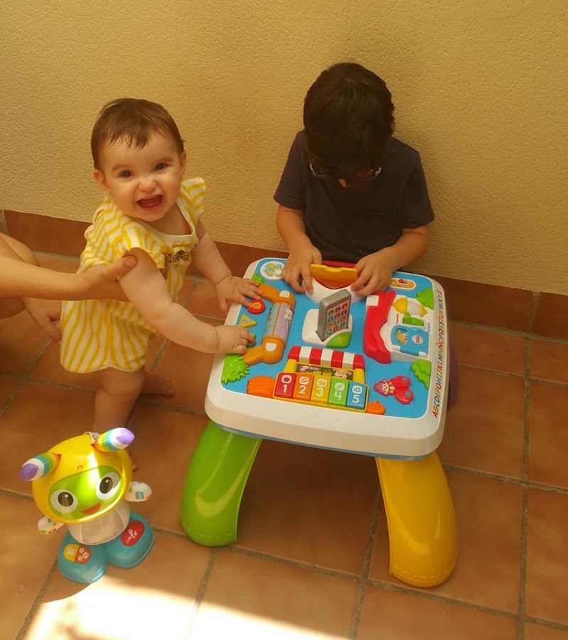Hace que el niño se mantenga en pie, haciendo equilibrio, Chloe le va dando vueltas a toda la mesa para tocar todos los botones.